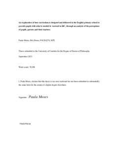 An exploration of how curriculum is designed and delivered in the English primary school to provide pupils with what is needed to ‘succeed in life’, through an analysis of the perceptions of pupils, parents and their teachers.