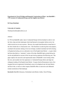 In 1794 Ann Radcliffe made a trip to Continental Europe with her husband in order to visit the Swiss Alps and other landscapes which had featured in her popular Gothic novels, but which she had not yet seen in person. However, the couple found themselves turned back at the Swiss border due to a bureaucratic error. This frustration in achieving their main purpose, combined with anxieties relating to the war in Europe, resulted in husband and wife returning to England and setting out on an alternative tour of the English Lake District – a region which had been described as a “miniature” version of the Alps. Radcliffe kept a journal during her travels and published an account of this two-part touring experience the following year. This paper explores the innovative and experimental nature of Radcliffe’s travel writing within this text, and considers how the experiences in Continental Europe inform and shape her subsequent reading of the English Lake District. It argues that her Rousseauian vision of an imagined but never experienced Switzerland, comes to be displaced onto the Lake District and that in this, as well as in other respects, Radcliffe offers an innovative and influential textual construction of that landscape.