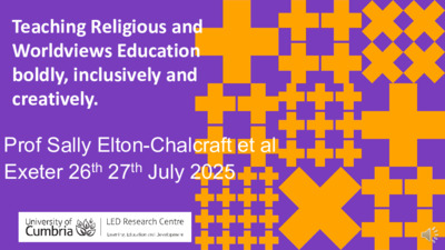 Dr Sally Elton-Chalcraft, Professor of Social Justice in Education at the University of Cumbria, UK, gave this lecture at the Association of University Lecturers in Religion and Education (AULRE) and Association of Religious Education Inspectors, Advisers and Consultants (AREIAC) 2025 joint conference, along with Alexandra Brown (Bristol University), Jane Yates (University of Cumbria and RE Consultant), Associate Professor Janet Orchard (Bristol University), Dr Linda Whitworth (RE Consultant), Dr Ruth Flannagan (Exeter University), Dr Kate Christopher (Anglia Ruskin University).